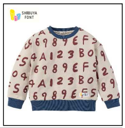 アパレル商品を作る際にどうしても発生してしまう、本来はゴミとなる裁断くずを再紡績して作ったリサイクル生地を使用した商品。「シブヤフォント」は、渋谷でくらし・はたらく障がいのある人の描いた文字や絵を、渋谷でまなぶ学生がフォントやパターンとしてデザインしたパブリックデータ。ボーイズ トレーナー 1529円
