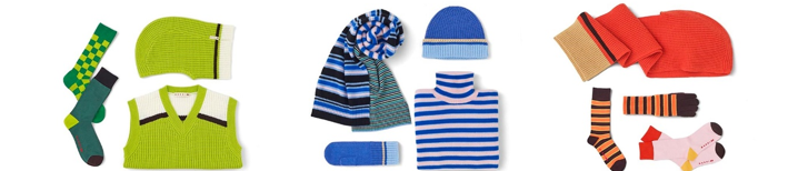 バラエティ豊かなグッズのラインナップは、日々のスタイリングに無限の可能性を与えてくれる。首元から頭まで温めてくれる今冬トレンドのバラクラバには、ベストやセーターと同じポップコーンニットを採用した。同素材のミトンやビーニーのほか、カシミヤやメランジニットでもグローブやストールを展開する。