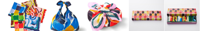 ハンドペイント風のオリジナルプリントが鮮やかなシルク100%のフロシキスカーフ。なめらかな肌ざわりに加え、シルク特有の艶と美しいドレープが、アクセサリーとして首元を彩ってくれる。また、風呂敷としての可能性も無限大で、ミニバッグやギフトラッピングとしても使える。計6柄のスカーフがセットになったコンプリートセットも同時に発売する。