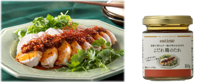 USMHはまた同日、プライベートブランド商品「eatime」 から「黒酢の香りとラー油の旨みが広がるよだれ鶏のたれ」も発売した。