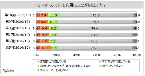 マイボイスコム(株)(東京都千代田区、高井和久社長)が、10回目となる「ネットスーパー」に関するインターネット調査を実施した。10月1日~10月5日にMyVoiceのアンケートモニターに対して行われ、回答者数は9842人だった。