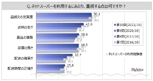 もう一つは、ネットスーパー利用時の重視点は、「品揃えの充実度」が利用経験者の5割、「送料の安さ」が4割強、「商品の価格」「品質の良さ」「配送の確実さ」が各30%台だったこと。