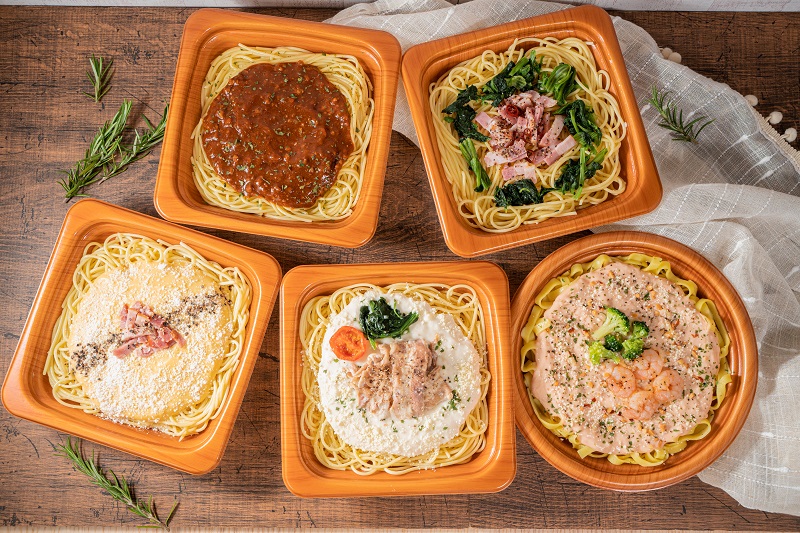 商品は卵黄を従来品の2倍以上配合してコクを出した「卵とチーズのカルボナーラ」、甘味や旨味が楽しめるパスタソースの「挽肉と香味野菜のミートソース」、クリームソースに、ソテードオニオンとコンソメ、隠し味としてポルチーニ茸ペーストを加えた「イベリコ豚をのせたクリームパスタ」491円、オイルのおいしさが楽しめる「オリーブオイル香るペペロンチーノ」426円、国産の牛乳、クリームにオマール海老の旨みを加え、芳醇で高級感のある味わいのソースが絡む「生パスタ 海老のクリーム」491円。