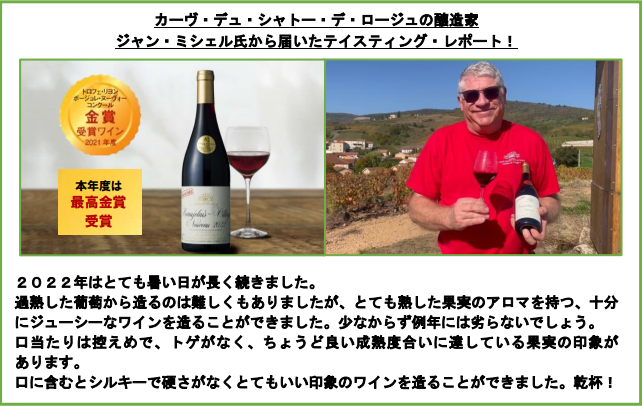 また、フランスで行われるボージョレ・ヌーヴォー唯一の公式コンクール「トロフェ・リヨン ボージョレ・ヌーヴォー コンクール」で最高金賞を受賞した「カーヴ・デュ・シャトー・デ・ロージュ・ボージョレ ヴィラージュ・ヌーヴォー ノンフィルター」を醸造したジャン・ミシェル氏からテイスティング・レポートも公開された。