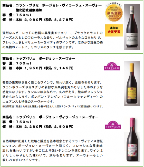 2022年は、商品提供コンクールで最高金賞を連続受賞している「コラン・ブリセ ボージョレ・ヴィラージュ・ヌーヴォー」(2980円)や「トップバリュ ボージョレ・ヌーヴォー」(1950円)などがラインアップされる。