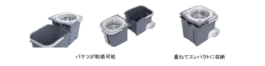 上記商品は脱着可能で重ねて収納できるバケツと水拭き、乾拭き双方に対応したモップのセットで家庭やオフィスの清掃の利便性に対応した仕様になっている。