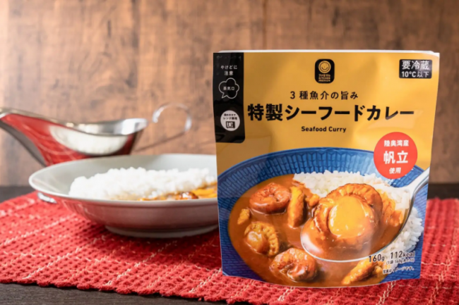 下北半島と津軽半島に囲まれ、八甲田山系からの水が注ぐ青森県陸奥湾で育った帆立と、ひと手間かけてバーナーで炙ることで香ばしい香りを付与した海老、いかの3種具材をつかった、魚介の旨みが味わえるカレー。カレーソースには、海老の香味や白ワインを使い、具材と相性よく仕上げた。
