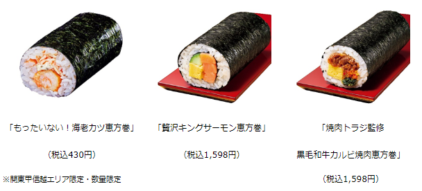 また、関東甲信越地区では、食品ロス削減のため、余剰在庫の海老カツなどを使用したアップサイクル恵方巻「もったいない!海老カツ恵方巻」(税込430円)の予約受付も行う。茨城県、栃木県、群馬県、埼玉県、千葉県、東京都、神奈川県、新潟県、山梨県、長野県の約4800店舗で発売される「もったいない!海老カツ恵方巻」には、余剰在庫の海老カツと、色目が基準外であったり、折れたりなどしてサイズが規格外になったカニカマ・海老を中具に使用して、食品ロスの削減を目指す。正規品を使用した場合と比較してお求めやすい価格で提供する。