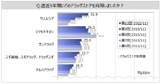 ドラッグストア利用者が直近1年間に利用したドラッグストアは(複数回答)、「ウエルシア」が31.9%、「マツモトキヨシ」「サンドラッグ」「スギ薬局、スギドラッグ、ドラッグスギ」が各20%台。過去調査と比べて、「ウエルシア」が増加傾向にある。
