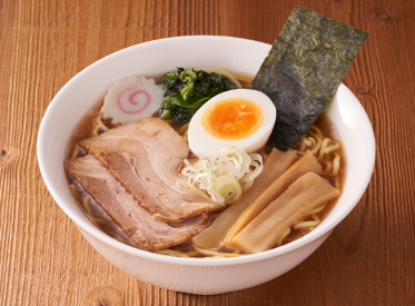 スープは牛テールの旨みが感じられる、鶏ガラベースの醤油スープ。ちぢれ麺を使用し、チャーシュー、玉子、メンマ、なると、ほうれん草、ねぎを具材としてトッピングした。アクセントにガーリックオイルを入れている。