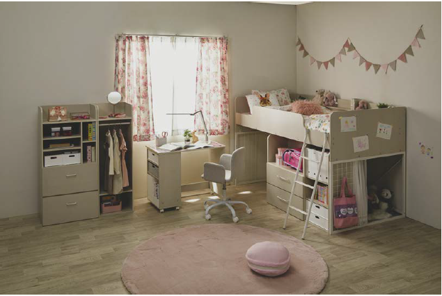 デスクとイスはセットでベッド下に収納可能で、省スペースで最適な学習環境をつくることができる。シェルフ付きデスクは収納部分が左右組み換え可能で、どんな部屋でも使いやすい仕様となっている。