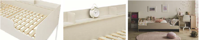 ベッドは寝⼼地も通気性も良いスノコタイプで、ベッドサイドには⼩物が置ける棚が付いている。組み替えればベッド単独でも使⽤できるため、子どもの成長に合わせてシングルベッドとして使うこともできる。