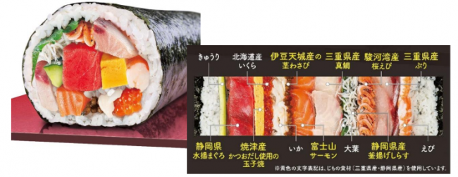 静岡県水揚げまぐろ、富士山サーモン、駿河湾産桜えび、三重県産真鯛、三重県産ぶりなど東海こだわりの美味しい食材を贅沢に使用した。1本3980円(税抜き、以下同じ)、ハーフ2000円。