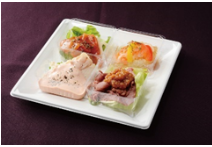 「ラ・ベットラ・ダ・オチアイ」で人気の前菜メニューをイメージした。「ローストビーフ山わさびソース添え」、「白身魚のエスカベッシュ」、「鶏肉のピンクソース」、「カポナータ」の4種類を盛り合わせた。