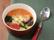 落合務シェフ直伝のレシピで、スープに白いんげん豆、じゃがいもペースト等を加え、トッピングにも炒めた玉ねぎ、ズッキーニ、にんじんに、トマト、じゃがいも、赤いんげん豆、ほうれん草盛り付けた野菜を食べるスープ。
