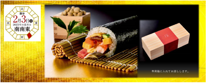 イオン琉球(株)(沖縄県島尻郡南風原町、鯉渕豊太郎社長)は 12月16日(金)、「イオン」「イオンスタイル」「マックスバリュ」39店舗と「AEON琉球 web予約」「おうちでイオン イオンネットスーパー」 のWEBサイトで2023年2月節分の恵方巻の予約受注を開始する。