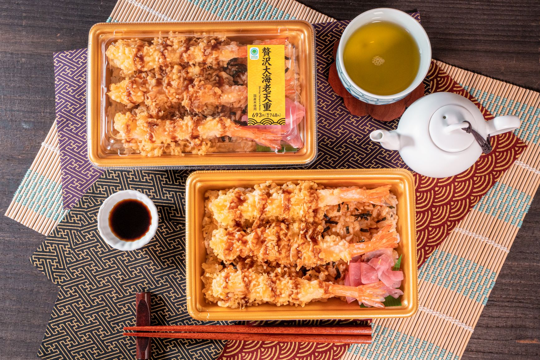 「贅沢大海老天重」は、専門店のてんぷらのような風味や色目、食感を目指して、材料や味付けにこだわった海老天が特徴だ。海老天は上質な薄力粉を使用して揚げることで、衣は口どけ良く仕上げた。醤油と出汁を使った甘みのある特製だれを付けてある、好みに合わせて味が調整できる。