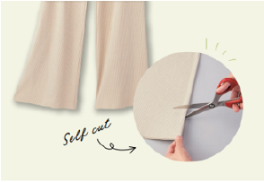 裾から10cmまでをフリーカットでき、長さ調節することができる。ダブルステッチ加工が施されているので、そのまま切ってもほつれない。
