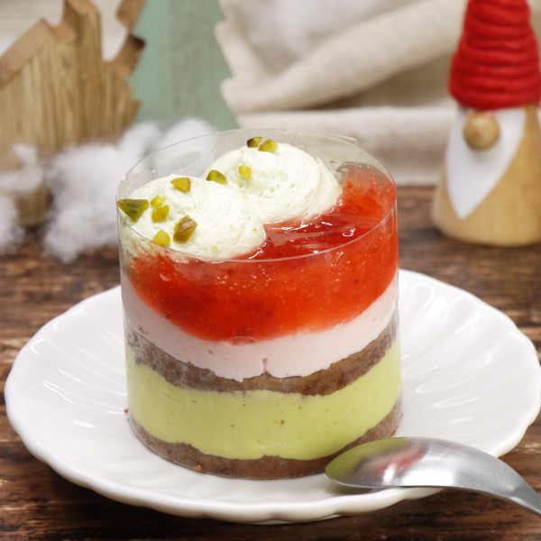 「ノエル・ピスターシュ」は直径約6.5cmで386円。ビターなココアスポンジ生地にピスタチオムースとストロベリームースを重ねた5層仕立てのピスタチオケーキ。
