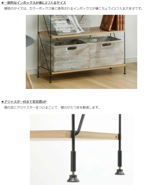 シェルフはインボックスが横に2つ入る細身のサイズ。床面とのがたつきを抑えるアジャスターも付いている。品揃えは4段(4,980円 税込以下同)と5段(5,980円)の2種類。