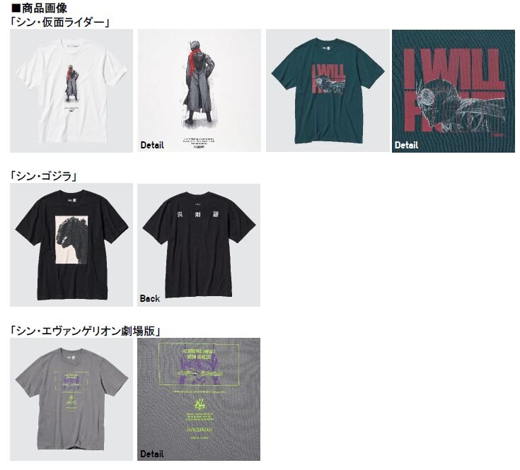 新作映画「シン・仮面ライダー」からは、仮面ライダーのデサインを手掛けた一人である前田真宏氏が映画制作のために描き下ろしたイラストや、仮面ライダーの青緑をボディ色に配しSHOCKERとの戦いに向かっていく様子を描いたTシャツが登場する。「シン・ゴジラ」のデザインでは、抜染(ばっせん)というプリント技法を用いて、劇中で描かれる “呉爾羅(ゴジラ)” の恐ろしさを表現した。「シン・エヴァンゲリオン劇場版」は、劇中に登場した “カシウスの槍” の描き下ろしアートを、「シン・ウルトラマン」はエネルギー源である「スペシウム133」と関連する数式を「UT」に落とし込んだ。
