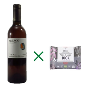 カ・デ・ノーチ アレスコ・パッシート〈白/イタリア・エミリア=ロマーニャ〉は500mlで4900円。陰干しした葡萄を36カ月樽熟成したことで、ぎゅっとエキスが詰まったデザートワイン。SO2(亜硫酸)無添加なのも魅力だ。このワインに合わせたいチョコレートは「カカオクルード ダークローチョコレート カカオ100%」。長期樽熟成からくるコーヒー、キャラメルのようなアロマがチョコレートの味わいを一層深める。ワインそのものが甘いので、ビターなカカオ100%のチョコレートと組み合わせが良く合う。