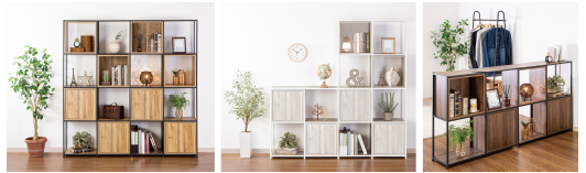 棚板・ボックスは、ミドルブラウン・ライトブラウン・ホワイトウォッシュの3⾊で展開。