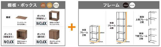また、フレームの中に⼊れこむボックスは「Nクリック」仕様となっていて、簡単に組み⽴てられる。ボックスを使えば⾒た⽬がすっきりした⽬隠し収納に、棚板を使えばディスプレイとして⾒せる収納として活⽤できる。