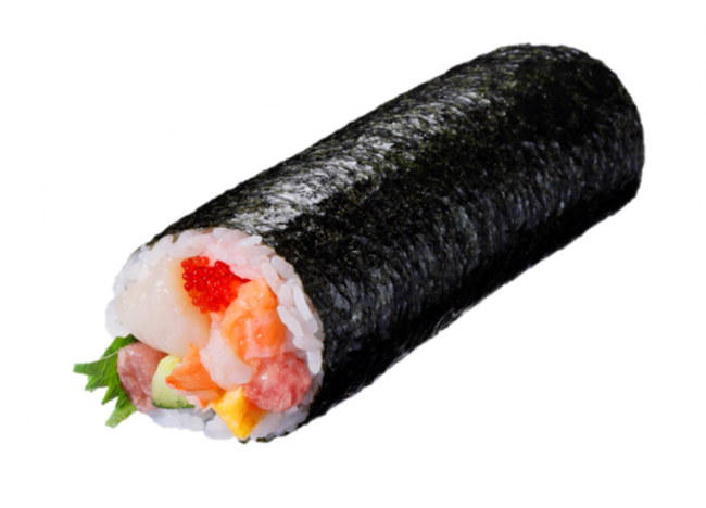 北海道産帆立・まぐろ・ねぎとろ・サーモンなど海鮮がたっぷり入った具だくさんの太巻。1本1390円、ハーフ698円。