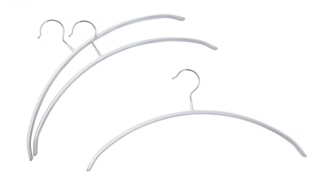 「アーチ型ハンガーLM01 3本組」、「ハンガーLM01 幅38㎝ 5本組」、「ハンガーLM01 幅45㎝ 5本組」、いずれも299円(税込み)で、カラーはホワイト・グレー・ブラックの3種類。