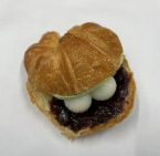 「クロワッサンサンド(伊勢茶クリーム)」は1個230円。三重、愛知、岐阜の60店舗で販売する。サンドウィッチのバンズにクロワッサンを取り入れ、白玉、あんこ、三重県の名産品である「伊勢茶」を使用したクリームを挟み込み、今までに味わったことのない商品を考案した。何気ない普段の日や、自分へのご褒美にももってこいの一品となった。