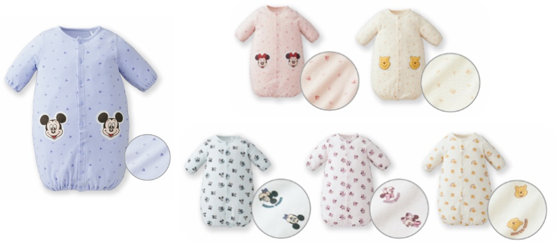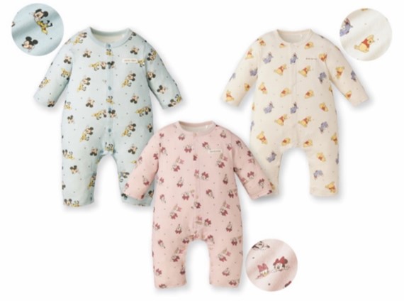 キャラクターの顔が特長の2種類のデザインを用意した。新生児の頃はドレスとして着用でき、足の動きが活発になる頃からは、股下のスナップボタンを留め替えてプレオールとして着用できる。便利な2WAY仕様。サイズは50~60cm、2860円(税込み、以下同じ)。