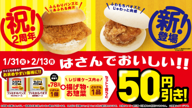 また、期間限定で、バンズシリーズの「ファミチキバンズ(タルタルソース)」「ファミからパオズ(油淋鶏ソース)」と、レジ横で販売している揚げ物・惣菜をセットで購入すると、50円引きになるセールを実施する。実施期間は1月31日(火)から2月13日(月)まで。
