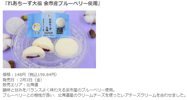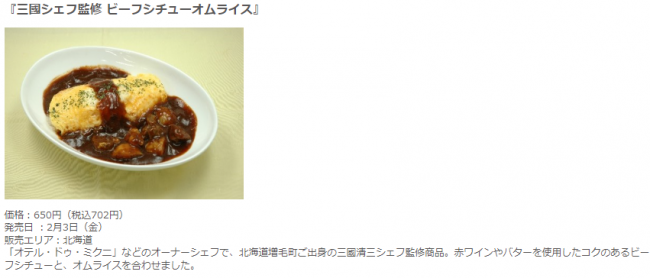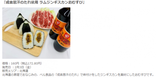 「成吉思汗のたれ使用 ラムジンギスカンおむすび」(160円 税別以下同)、「れあちーず大福 余市産ブルーベリー使用」(148円)「三國シェフ監修 ビーフシチューオムライス」(650円)など北海道産の食材やなじみのあるブランドを使った商品となっている。