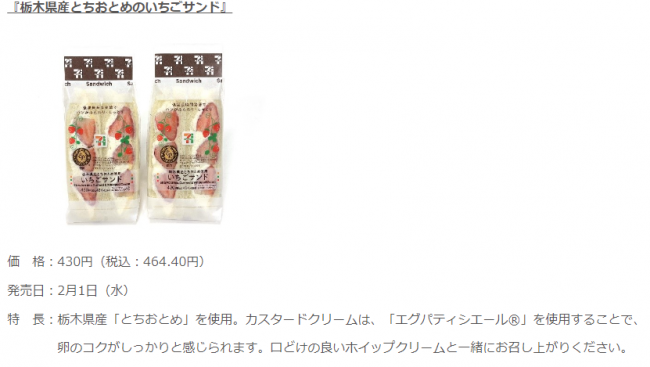 今回の発売商品は、栃木県産の優良な食材であるニラや「ニラそば飯おむすび」(150円)、しっかりとした甘さとほどよい酸味が特長の「とちおとめ」等を使用した「いちごサンド」(430円)、「とちおとめのちぎりパン」(168円)など5品で1月31日から順次発売開始している。今回発売する商品売上げの1%は、栃木県重点戦略である「とちぎ未来創造プラン」に掲げる活力ある農林業実現プロジェクトに寄付される。