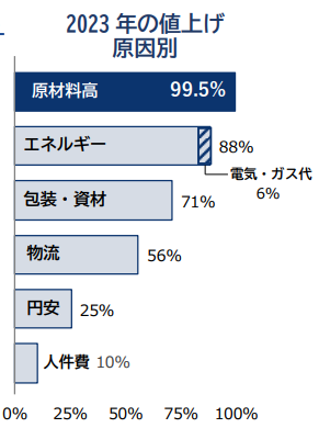 一方で、原油高などのエネルギー(88%)、プラスチック容器などの包装・資材(71%)のほか、円安(25%)なども理由にあがった。