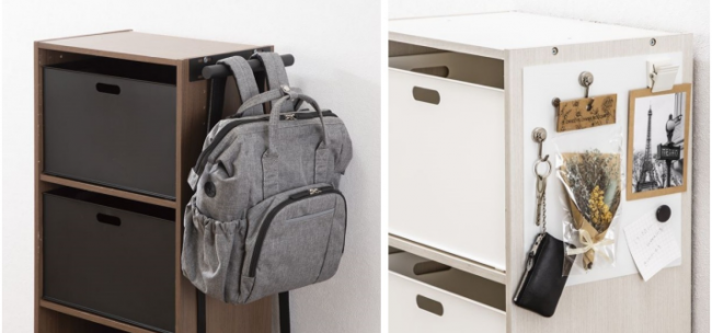 今回ニトリは、カラーボックスの側⾯を有効活⽤したいという顧客の要望に応え、ニトリの⼈気カラーボックス「COLOBO(カラボ)」シリーズに取り付けられる、バッグハンガーとマグネットプレートを開発した。