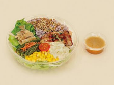 ねぎ塩チキンにたけのこ、ポテトサラダ、コーン、いんげん、人参、ミニトマトとスーパー大麦・雑穀をのせたサラダ。玉ねぎドレッシング入り。