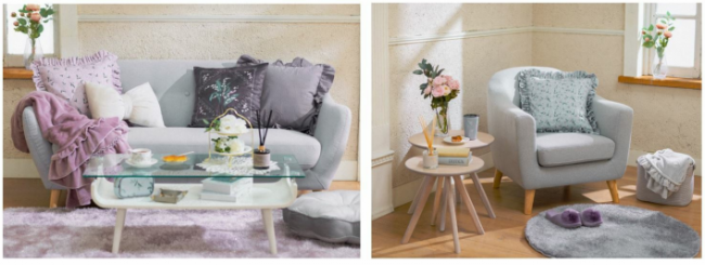 クッションを使ってリビングに春らしい彩りを。左写真/「クッションカバー(スズランガラフリルRO)」999円「クッションカバー(スズランガラ NV NS1)」599円。右写真/「クッションカバー(スズランガラフリルBL)」999円。