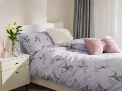 ブルーとホワイトでまとめれば、寝室は清潔感漂う癒しの空間に。「掛け布団カバー(スズランガラ NS1 S)」3490円、「まくらカバー(スズランガラ NS1)」899円。