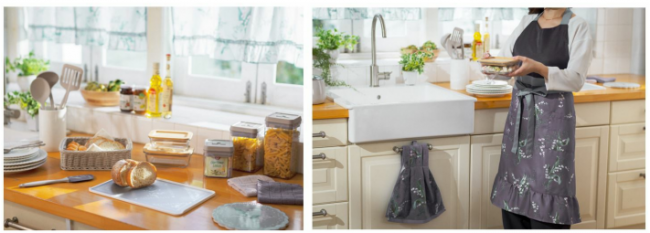 キッチンツールとやエプロンをすずらん柄でコーディネート。左写真/「小窓カーテン(スズラン 100X45NS1)」799円、「シリコーンヘラ(スズランガラ NS1)」199円、「カッティングボード(スズランガラ NS1)」999円、「トリベット(スズランガラ NS1)」399円。右写真/「エプロン(スズランガラ NS1)」1790円、「ドレスタオル(スズランガラ NS1)」499円。