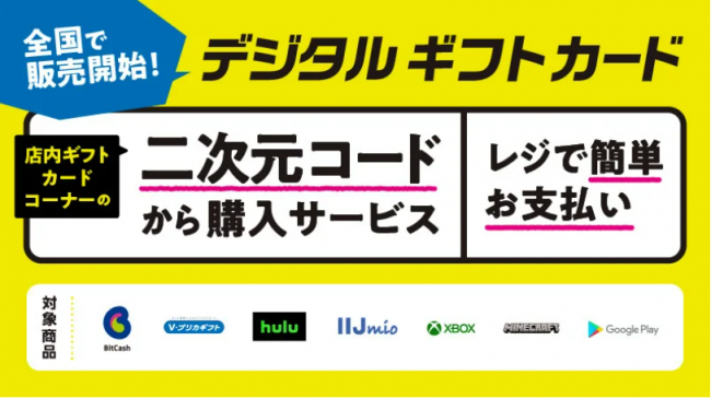 対象商品は、BitCash・Vプリカギフト・Huluチケット・IIJmio・Xbox・マインクラフト・Google Play ギフトコードの7つで、順次拡大を予定している。