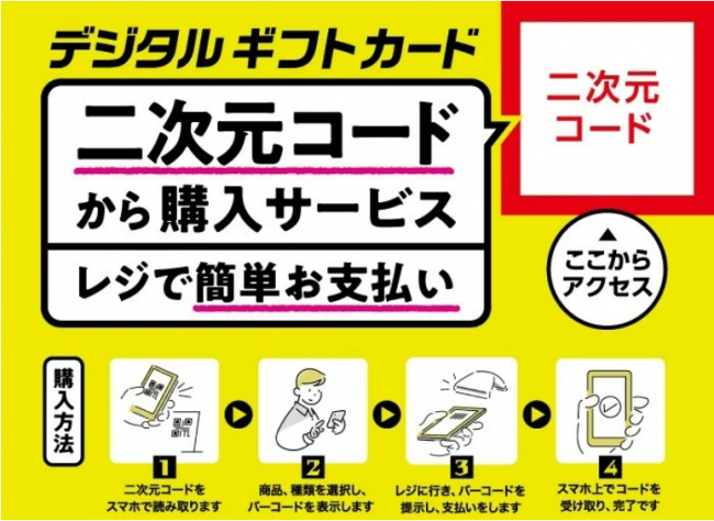 デジタルギフトカードは、ローソン店内ギフトカードコーナーのPOPにプリントされている二次元コードをスマホで読み取り、スマホ画面に表示されたバーコードをレジで提示して支払うことで、ネットでの支払いなどに使えるギフトカードのコード番号を簡単に購入することができるサービスだ。