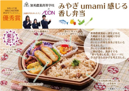 今回販売する「みやぎ umami(うまみ)感じる香(かぐわ)し弁当」は宮城県加美町の「宮城県加美農業高等学校」の生徒たちが考案し、「優秀賞」と「WEB投票特別賞」をダブル受賞した弁当で、イオンとミニストップが商品化した。本体価格は498円。