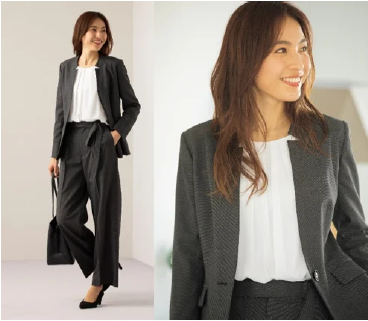 ジャケット2型、スカート3型、パンツ2型と豊富な種類を展開する。定番のテーラードジャケットやクロップドパンツ・セミフレアスカート・タイトスカートのほか、刻み襟ジャケットやデザインベルトがポイントのワイドパンツ、ロングタイトスカートを新しく展開する。デザインベルトは既に縫い付けられており、結び直す手間がなく、気軽に着用できる。価格はジャケット2万5300円、スカート1万3200円、パンツ1万5400円、サイズは1号~17号。