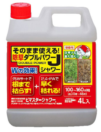 コメリオリジナルの除草剤「除草ダブルパワーJ」は、配合されている「グリホサート」と「2,4-PA」のダブルの成分で、早く根まで枯らすことができる。