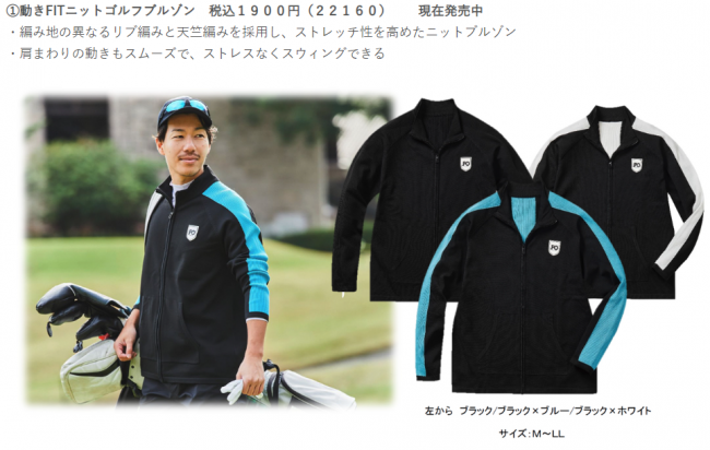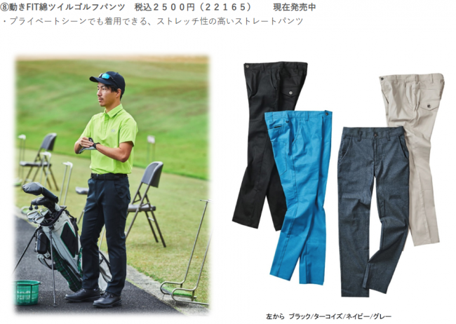 今回発表する13アイテム中、「動きFITニットゴルフブルゾン」(1900円 税込 以下同)、「動きFITゴルフ半袖ポロシャツ」(1500円)、「 動きFIT綿ツイルゴルフパンツ」(2500円)など8アイテムがこのシステムを採用している。