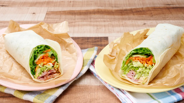 左が「ラップサラダ(野菜とベーコン)」、右が「ラップサラダ(野菜とハム)」。どちらも本体価格230円(以下同じ)。野菜とベーコンはベーコンとデミグラスソースを包み、野菜とハムはハムとすりおろし野菜ソースを包んだ。