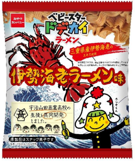 「ドデカイラーメン伊勢海老ラーメン味」は本体価格98円。デスクワークでの作業が増えてきた今、気軽に食べられて手が汚れにくいということをコンセプトにした。また、伊勢志摩産の食材にこだわり、三重県産伊勢海老のエキスを使用したことが特徴だ。