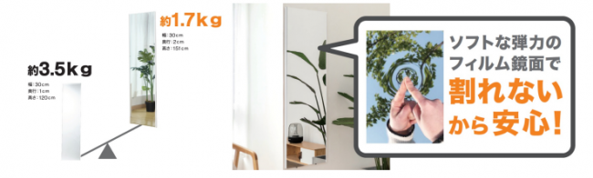 今回ニトリは、「ミラーが割れるとガラスの破⽚が⾶び散って、怪我が⼼配」という顧客の声に応え、割れない軽量のフィルムミラーを発売した。ソフトな弾⼒のフィルム鏡⾯を使⽤しているため割れないので、地震対策として最適だ。また、子どもやペットがいる家庭でも安⼼して使用できる。